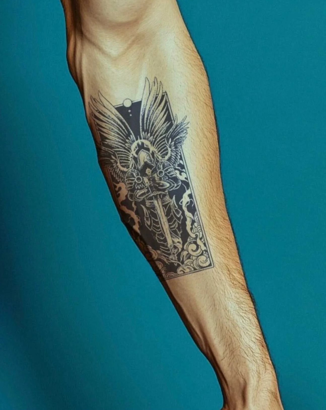 מלאך עצום עם כנפיים פתוחות וחרב זוהרת, עטוף בפרטים עדינים שמעניקים תחושת נצחיות. הקעקוע הזה מדבר על אמונה, על הגנה, ועל ההבטחה לשמור – גם כשהכול סביבך נופל. עיצוב למי שמאמין בכוח של אור גם בתוך החושך.