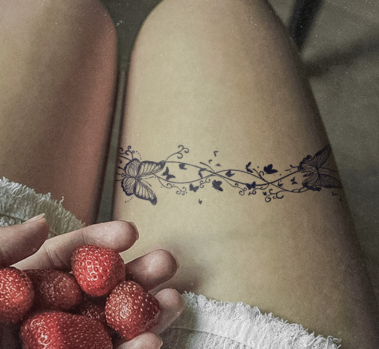 קעקוע Butterfly Veil מתאר שני פרפרים הקשורים ביניהם בגפן של פריחה עדינה. סמל לשחרור רגשי, נשימה חדשה, והיכולת לאהוב את עצמך שוב.
