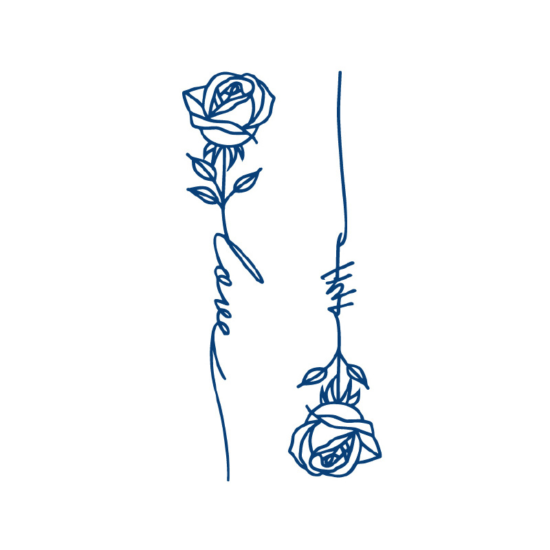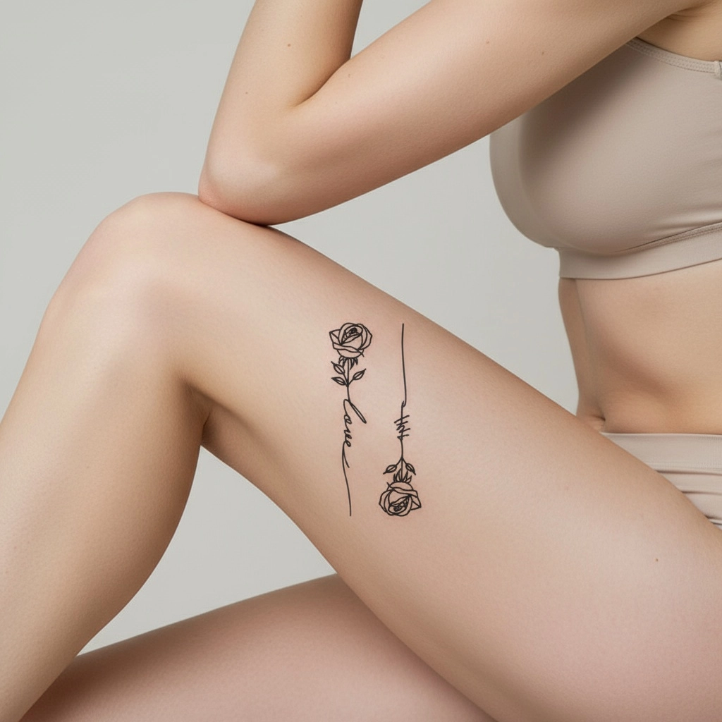 שתי ורדים דקות, אחת זקופה ואחת תלויה מטה עם קו שמחבר ביניהן ויוצר את המילה “love”. הקעקוע מייצג את שני הצדדים של אהבה – היפה והכואב, החיבור והמרחק. עיצוב פשוט שמחזיק בתוכו אמת מורכבת.