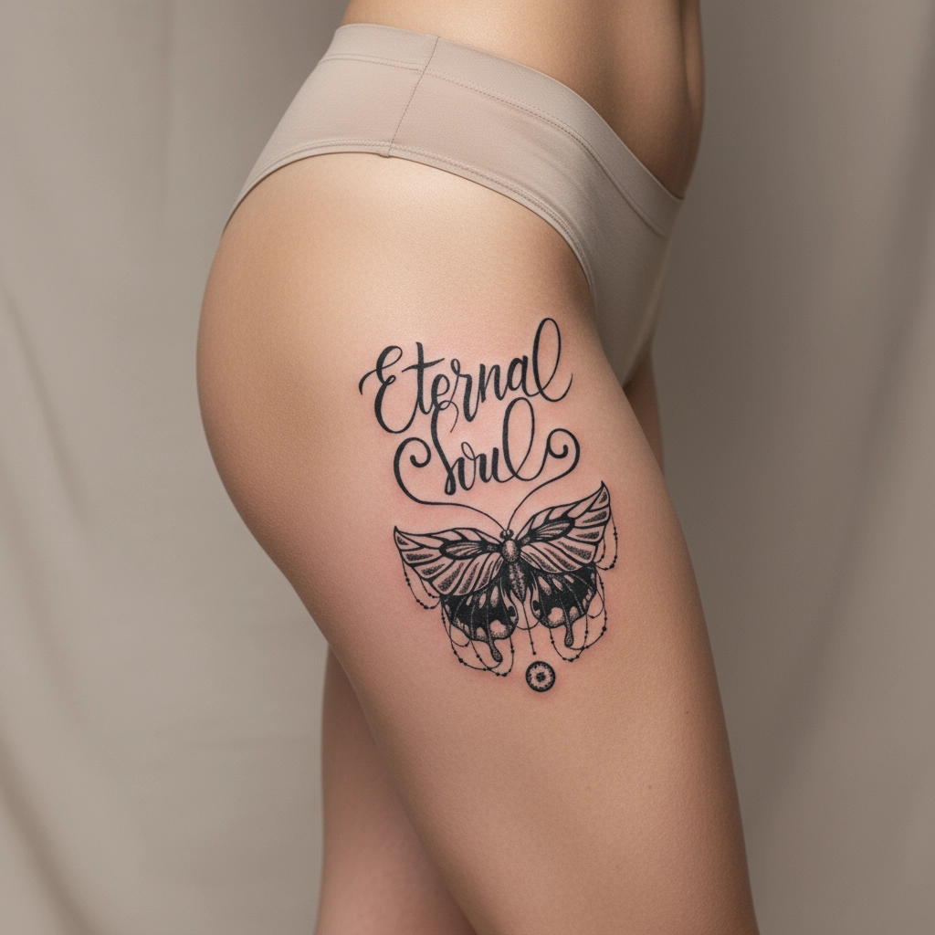 פרפר גדול ומתחתיו הכיתוב “Eternal Soul”. הקעקוע הזה מדבר על נשמות שמסרבות להיעלם — על אנשים שנגעו בנו ונשארו בצללים של הלב. שילוב בין עדינות וגבורה, בין פרידה לתקווה.