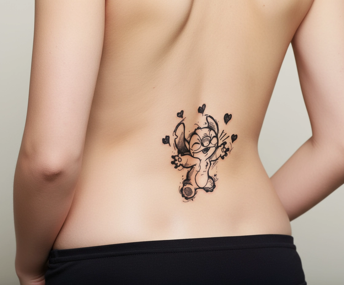 קעקוע מצויר חמוד ושמח של דמות אהובה שמפיצה חיוך ואנרגיה טובה. מושלם למי שאוהב לשמור על וייב חיובי וצעיר.