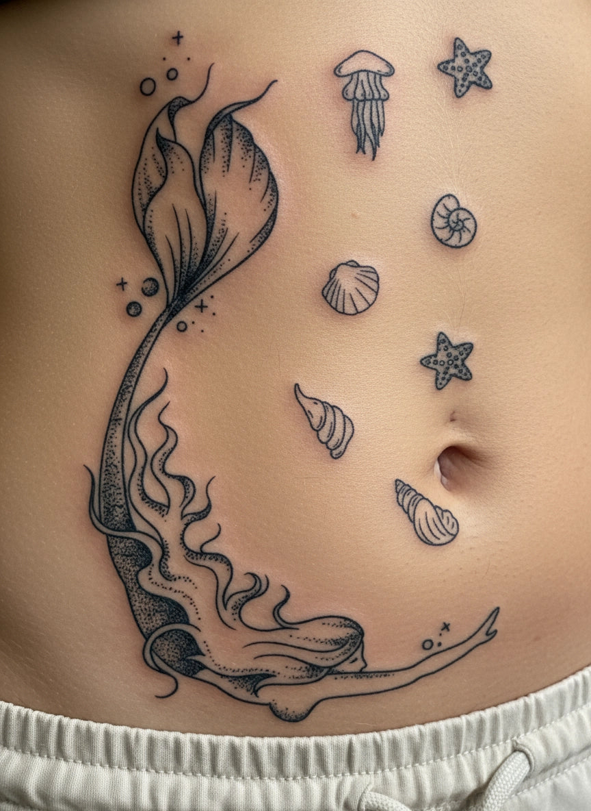 זנב בת ים מסתחרר בגלי ים ויצורי עומק, מסמל חופש, נשיות ואהבה לים. עיצוב שקט אך עוצמתי, כמו נשימה עמוקה מתחת למים.