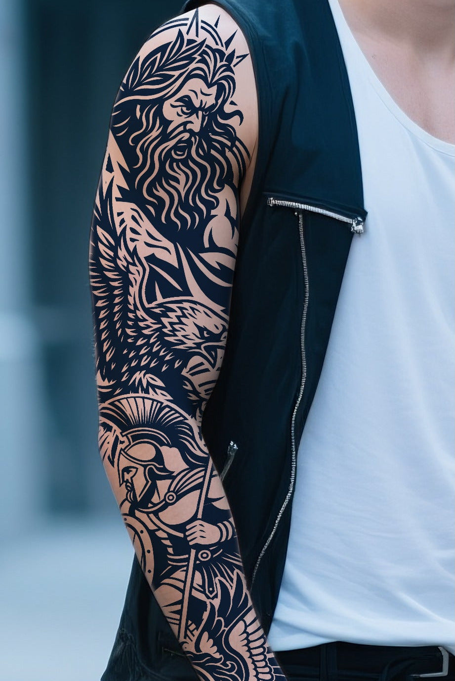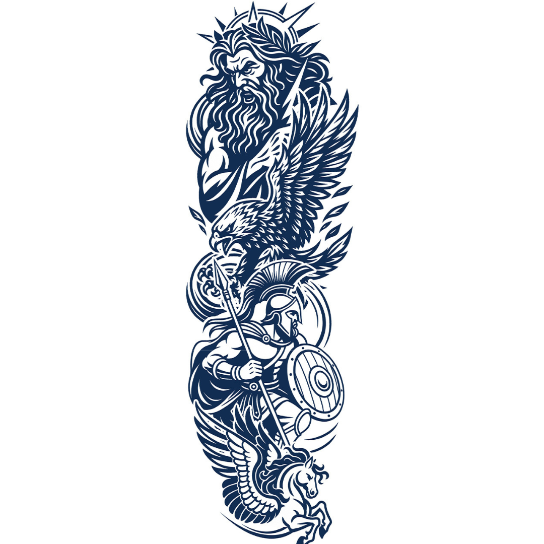 שרוול המתאר דמויות מהמיתולוגיה היוונית – זאוס, לוחם מכונף ונשר עוצמתי. זהו קעקוע שמבטא כוח אלוהי, מנהיגות וחיבור לאש ולרעם – סמל לאנשים שמובילים ולא מונחים.