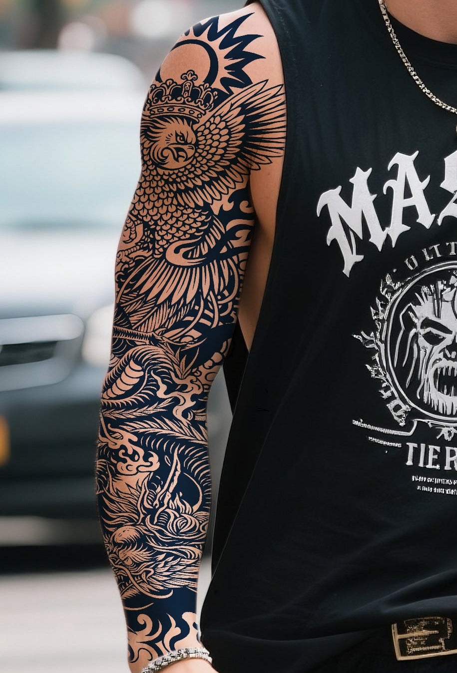 שרוול עם עוף החול המתנשא מהלהבות והדרקון שמתפתל סביבו. סמל להתחדשות, לידה מחדש וניצחון על הכאב. מתאים למי שעבר תקופה קשה ובחר לקום ממנה חזק יותר.