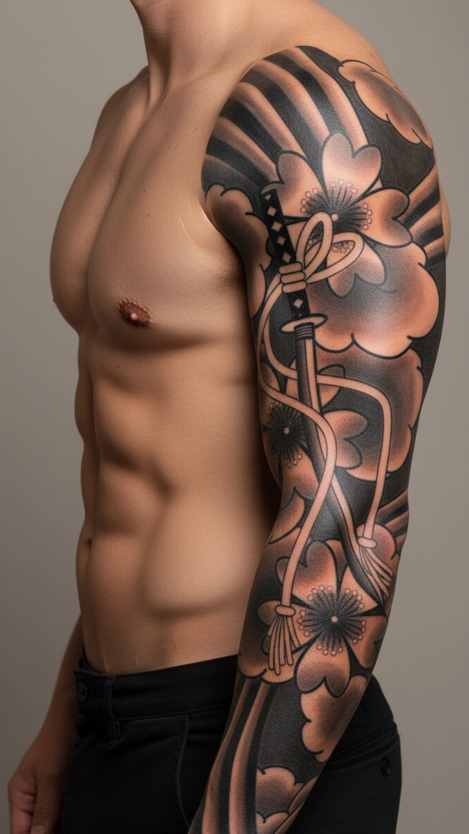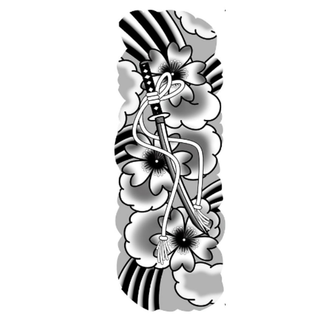חרב אלגנטית עטופה בפריחת דובדבן. שילוב בין עוצמה ליופי — הלהב מסמל אומץ ומשמעת, בעוד הפרחים מביאים רוך, איזון והרמוניה פנימית.