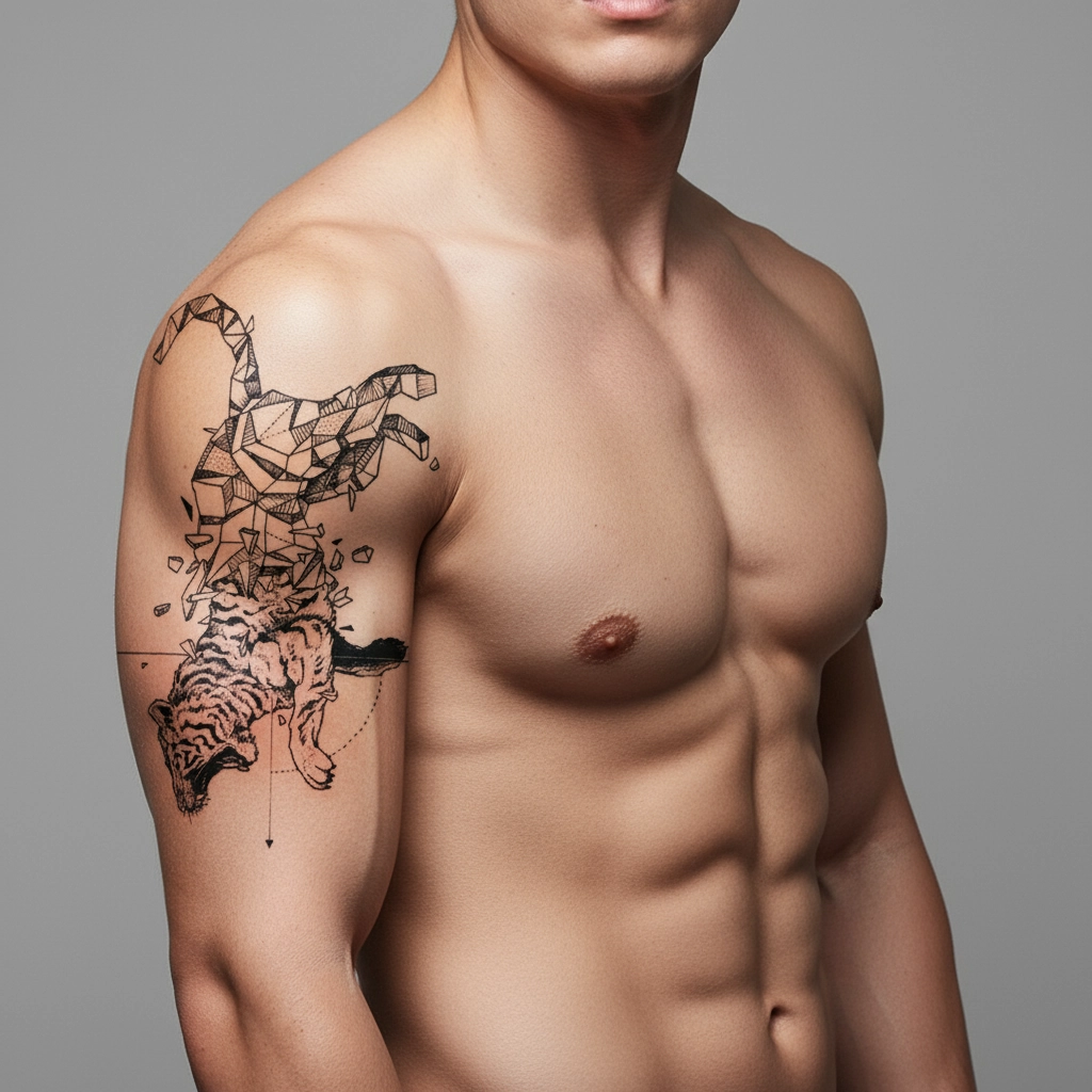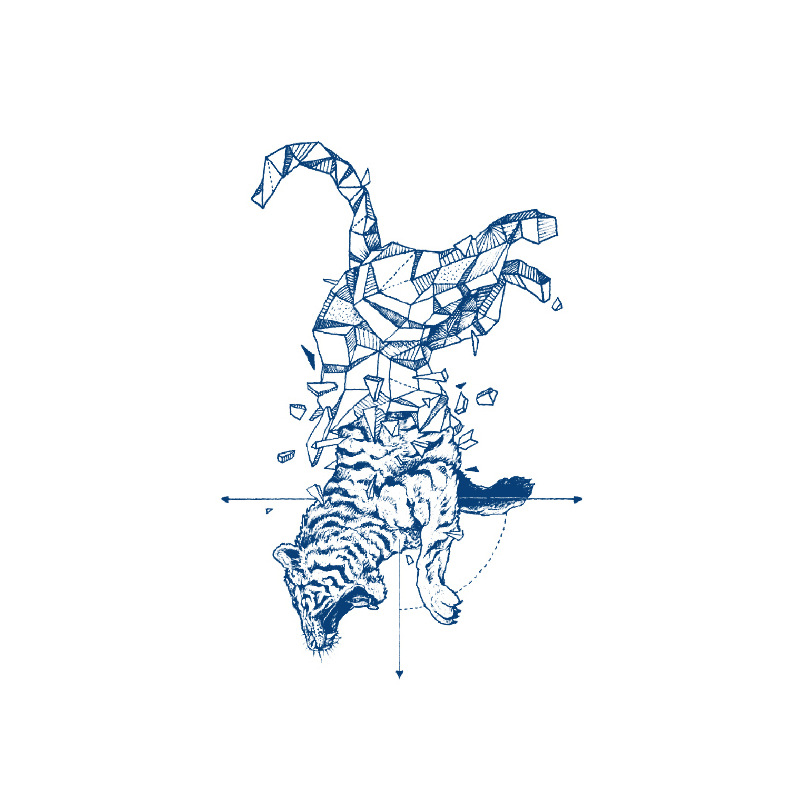 טיגריס עשוי חצי בשר ודם וחצי צורות גיאומטריות מתפרקות, כאילו נבנה ומתפרק בו-זמנית. הוא מסמל את המאבק בין אינסטינקט לבקרה – בין פראי למודע. קעקוע של אדם שנלחם בעצמו כדי להפוך לגרסה המדויקת ביותר שלו.