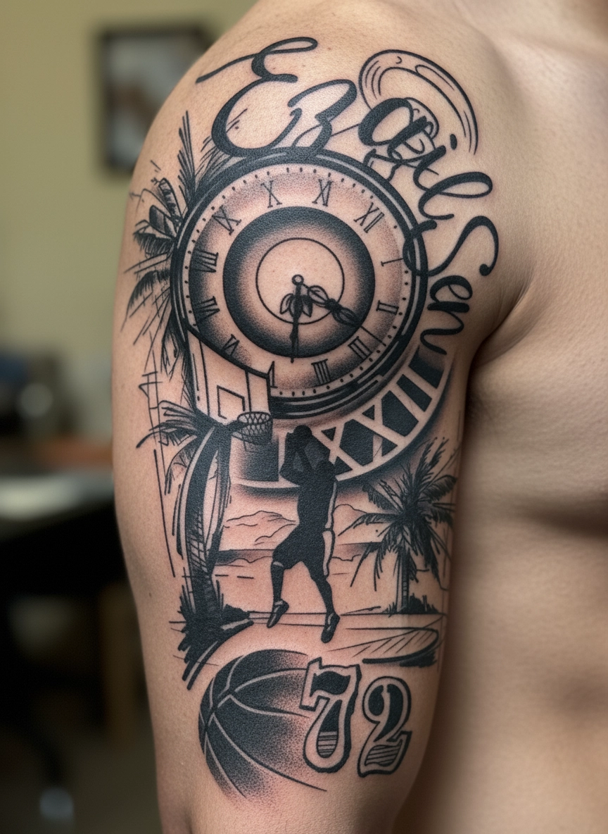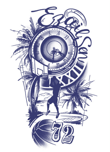 שעון חול וכדור כדורסל יוצרים דימוי של זמן ותשוקה. הקעקוע מדבר על המרדף אחר החלום, על הרצון להשיג יותר לפני שהזמן נגמר. הוא נוגע בנקודה שכל אחד שמרגיש תשוקה אמיתית מכיר – שהמשחק לא נגמר כל עוד אתה משחק.
