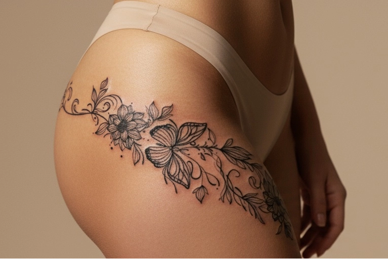 קעקוע Whisper Garden מציג פרחים קטנים ומעוגלים, פרוסים בקומפוזיציה מאוזנת המזכירה גן של סודות קטנים. עדין, נשי, כמעט לוחש.