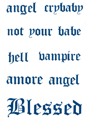שורות של מילים חדות כמו להב – “angel”, “vampire”, “blessed” – מניפסט של זהות. קעקוע למי שלא מתנצל על מי שהוא, עם אותיות שמספרות סיפור של כוח וביטחון עצמי.
