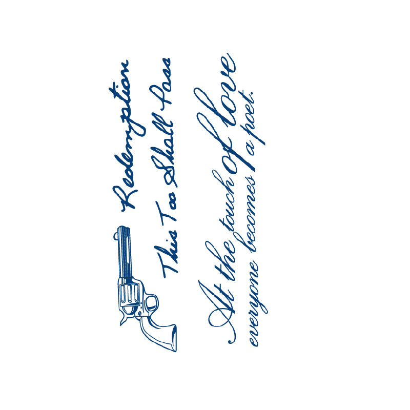 כיתוב אלכסוני מעוצב עם דמות של אקדח קטן. שילוב בין מילים חזקות לסמל של מאבק פנימי. הקעקוע מדבר על חטאים שנשטפו, על גאולה אישית דרך מילה, דרך אהבה, דרך כוח פנימי.
